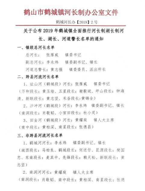 關(guān)于公布2019年鶴城鎮(zhèn)全面推行河長制湖長制河長、湖長、河道警長名單的通知