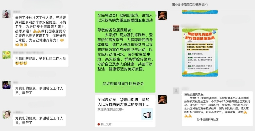 同時,通過業(yè)主群、樓棟群、村民群等發(fā)送有關知識,線上陣地常態(tài)化發(fā)聲,重點面對跨市通勤人員、老年人、兒童等群體,積極發(fā)動全民參與防蚊滅蚊,讓蚊媒防疫信息“觸手可及”。